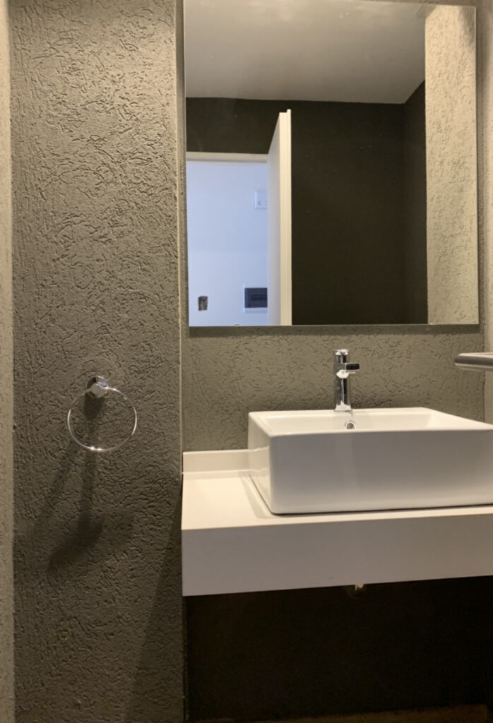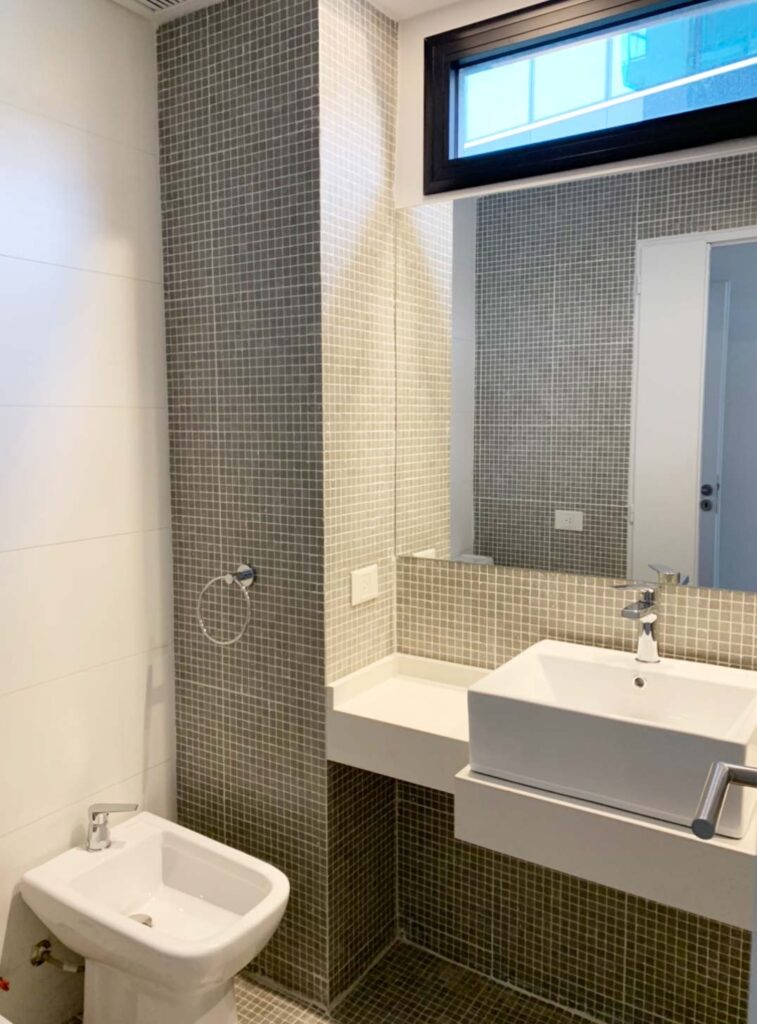 - Porcelanato en baños en combinación blanco y venecita.